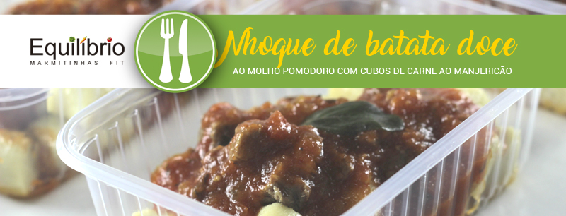 “Nhoque de batata doce ao molho pomodoro com cubos de carne ao manjericão” faz parte do cardápio fit da Fit Equilíbrio.